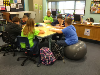 | Brandon Ellis leads Sophomores Matt Wilder and Susanna Getz, Senior Jonah Martz and Sophomores Emily Ferguson and Amanda Pippen in the "Thriller" dance as the mutants at table 9 show what it means to be a "Casualty of Love." |